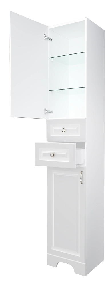 Пенал, который способен решить все основные задачи по компактному и удобному хранению в ванной комнате косметики, личных вещей, банных принадлежностей и бытовой химии. Вместительный и невероятно удобный, он оснащен двумя отделениями с полками и двумя выдвижными ящиками, поэтому успешно воплощает идею "все в одном месте". Его прочный и надежный фасад выполнен из МДФ и дополнительно покрыт пленкой ПВХ, обеспечивающей необходимую защиту от воздействия влаги, а поистине классический лаконичный дизайн делает пенал подходящим для любого интерьера - от традиционного до современного.