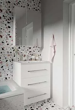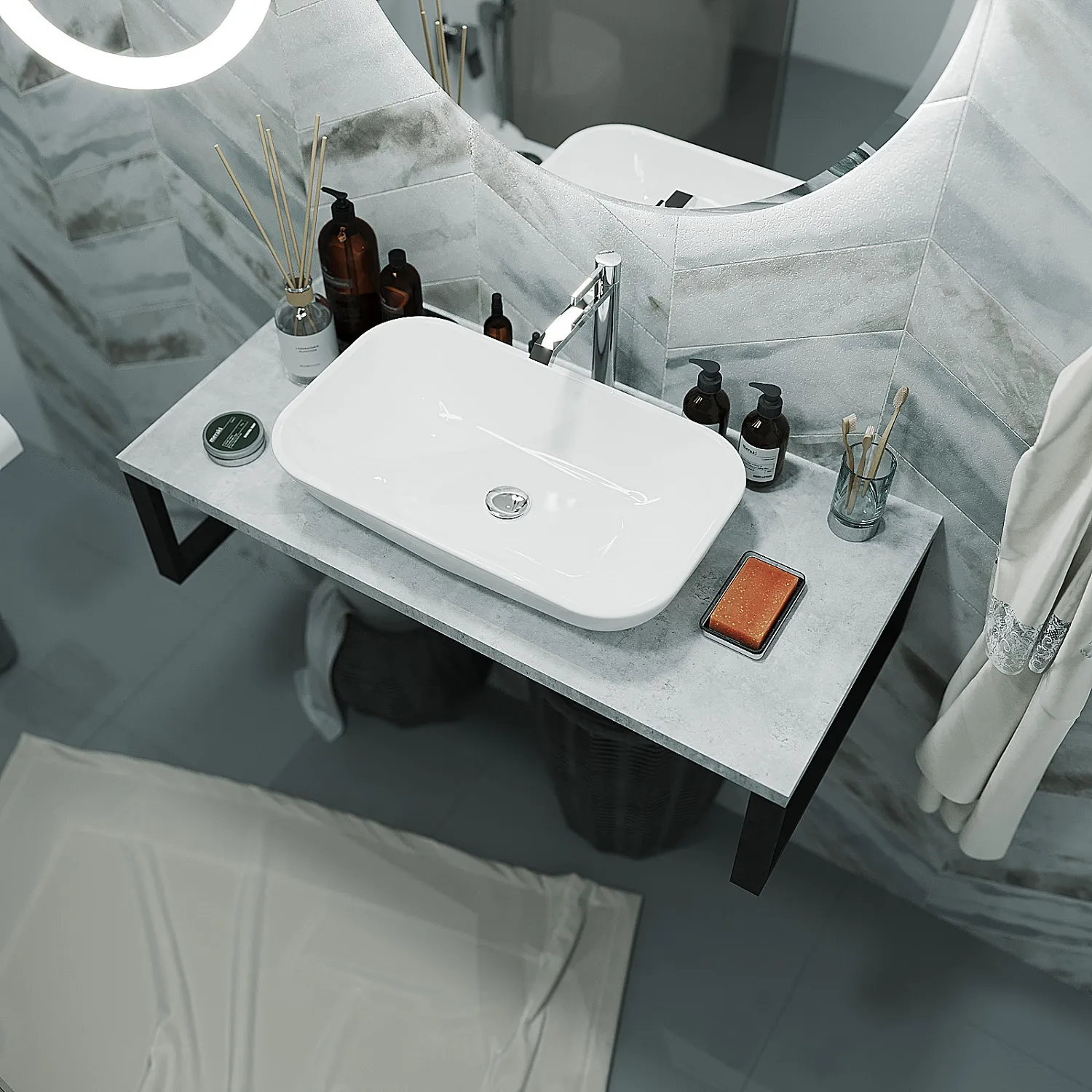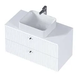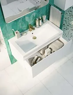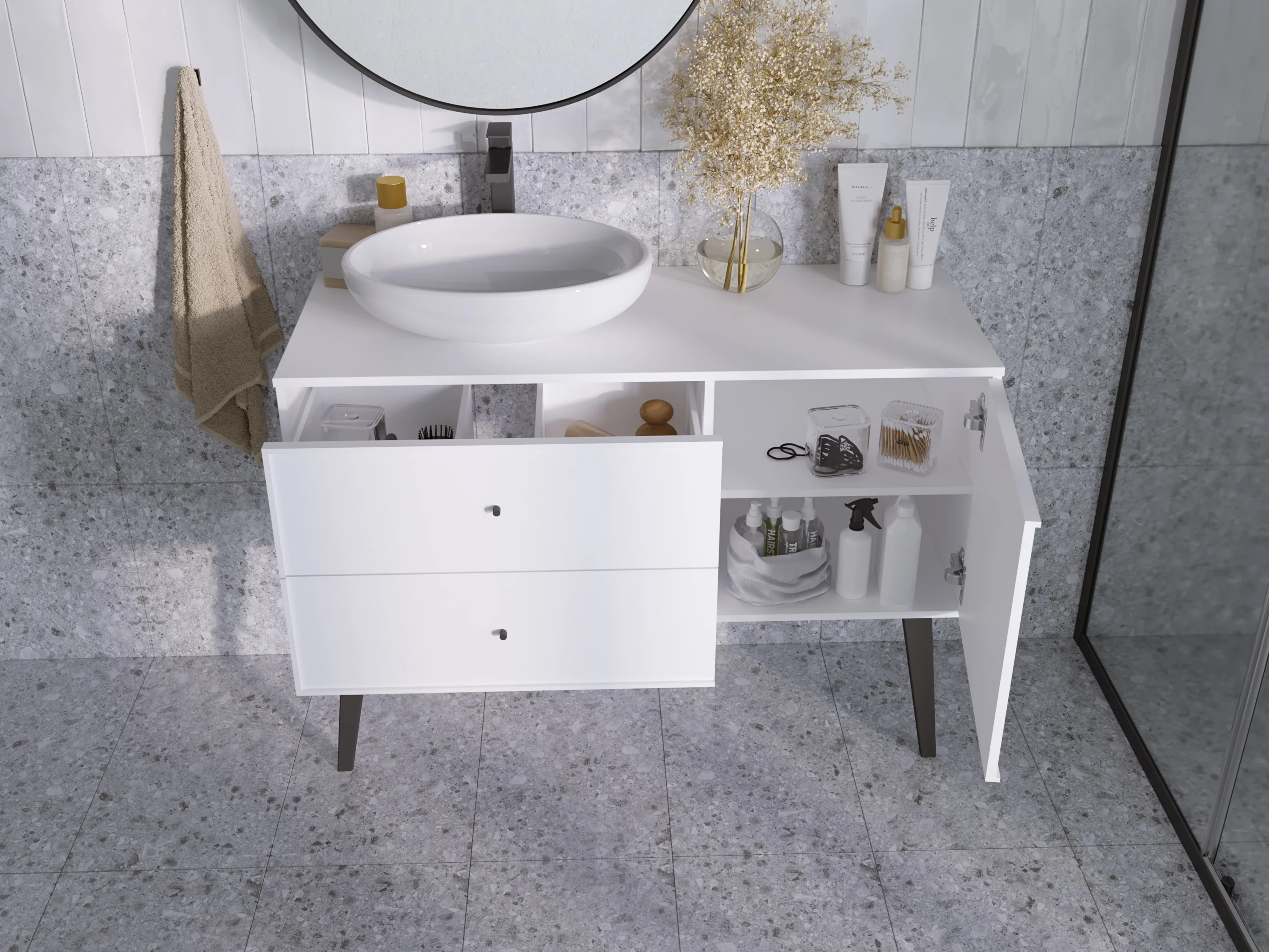 Столешница под стиральную машину во всегда актуальном белом цвете, которая позволяет с максимальным комфортом и удобством организовать пространство даже в небольшой ванной комнате. Исполненная в универсальной и одновременно стильной прямоугольной форме, она включает в себя место под раковину и функциональную зону для размещения косметики, личных принадлежностей и аксессуаров. Материалом исполнения столешницы является МДФ, а ее дополнительная защита от воздействия влаги и внешних повреждений обеспечивается покрытием корпуса пленкой ПВХ.Характеристики: