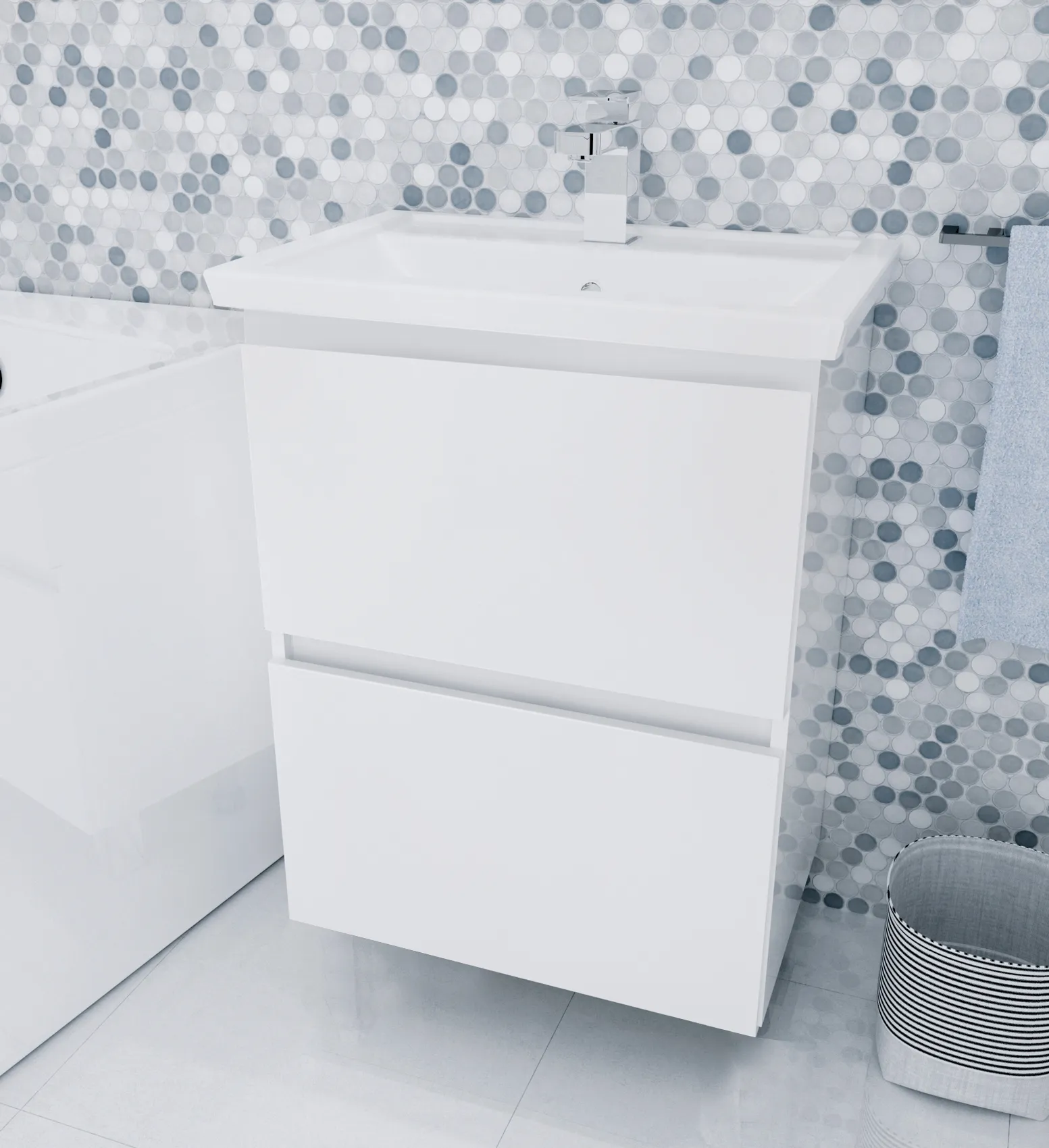 Стильная и лаконичная тумба для ванной комнаты, в дизайне которой нет ничего лишнего - только минимализм и акцент на безоговорочную функциональность. Отсутствие ручек и строгие геометрические формы делают ее актуальной для интерьеров в абсолютно любой современной или эклектичной стилистике. Благодаря качественной фурнитуре ежедневное использование тумбы отличается максимальным удобством. Практичное разделение ящиков на небольшие отсеки позволяет с комфортом организовать хранение косметики и других вещей. Глянцевая белая поверхность гармонично дополнит пространства в любой цветовой гамме.