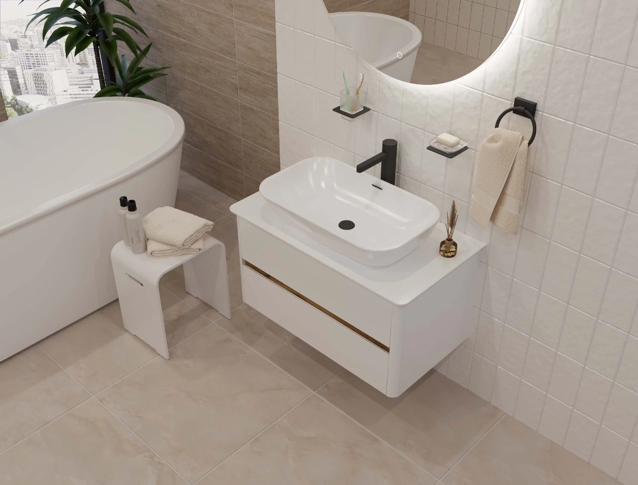Матовый фасад, интегрированные ручки, стеклянная столешница и полки в тон теплому дереву придают интерьеру изящность и подчеркивают его уникальный характер. А белый цвет делает тумбу подходящей для большинства интерьеров ванной комнаты.
