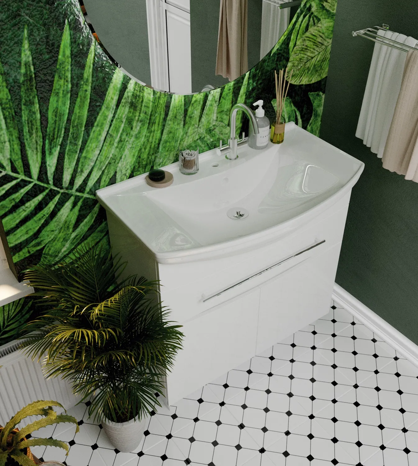 Изящная и лаконичная тумба, буквально парящая в воздухе. Она превосходно подойдет для функционального дополнения небольших пространств, а также для тех, кто отдает предпочтение легким, негромоздким и при этом стильным предметам мебели для ванной комнаты. Белый глянцевый фасад эффектно дополнен столешницей из белого стекла, которая, тем не менее, не нуждается в трудоемком уходе и надолго сохраняет свой привлекательный и эстетичный внешний вид. Дизайн тумбы воплощает современный и практичный подход к функциональности мебели и удобству ее ежедневного использования.