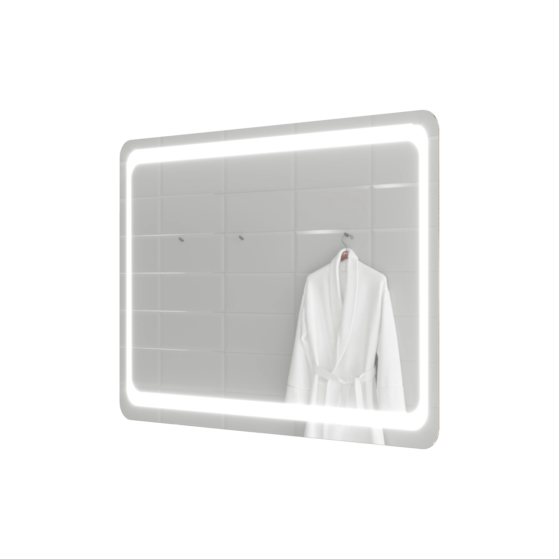 Зеркало, выполненное на стыке классических и современных решений в дизайне аксессуаров. Оно имеет традиционную форму прямоугольника с мягкими краями, которая подчеркивается дублирующим ее рисунком, выполненным методом художественного матирования. Мягкий свет, излучаемый по всему периметру зеркала, не только делает более удобным его ежедневное использование, но и позволяет создавать в ванной комнате особенно уютную атмосферу. Для изготовления зеркала используется французское или бельгийское зеркальное полотно на основе серебряной амальгамы, что значительно увеличивает срок службы модели.